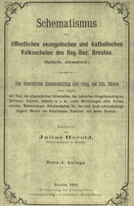 Unter der Regierung Friedrichs des Großen befanden sich (um 1770) etwa 21 Elementarschulen. Einhundert Jahre später veröffentlichte Julius Herold, Mittelschullehrer in Breslau das Buch "Schematismus der öffentlichen evangelischen und katholischen Volksschulen des Reg.-Bez. Breslau". Dieses Werk, im Selbstverlag des Herausgebers - Commissionsverlag von Priebatsch´s Buchhandlung - verlegt, kann man zurecht als ein Schuladressbuch für den Regierungsbezirk Breslau bezeichnen. Bereits in den Jahren 1873, 1879 und 1884 erschien dieser "Schematismus". Auf Beschluß der Konferenz der Königlichen Kreisschulinspektoren im Januar 1888 beauftragte man den Autor, in der vierten Auflage alle evangelischen und katholischen Kirchen des Regierungsbezirkes Breslau aufzunehmen.